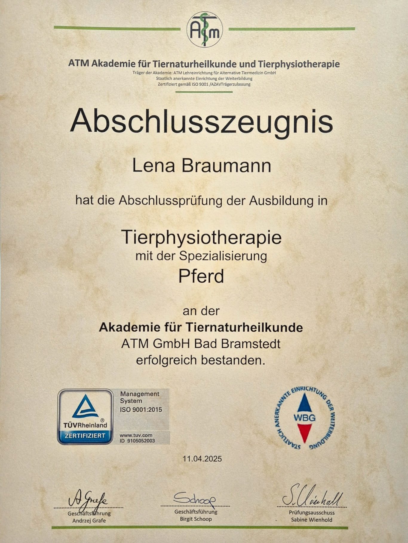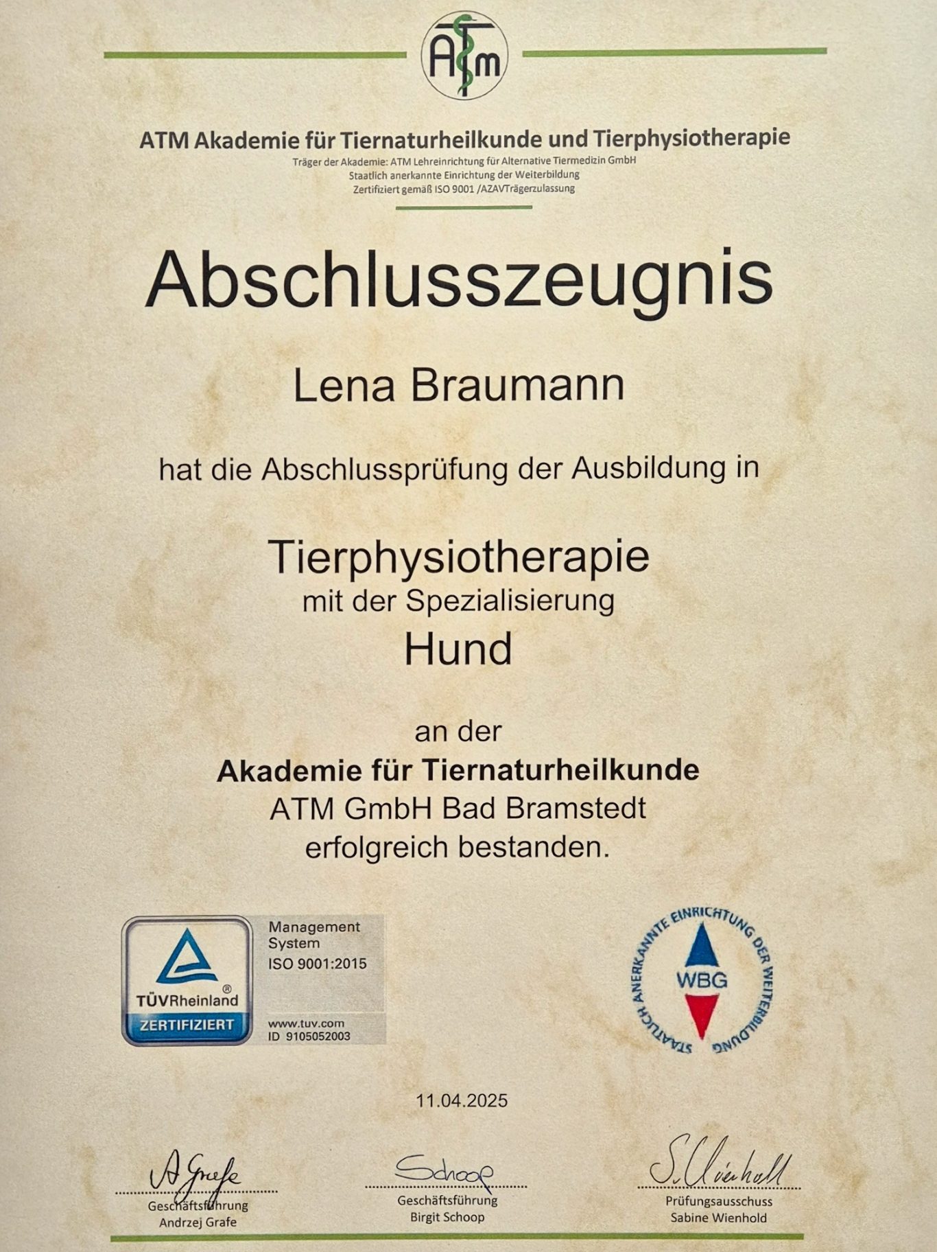 Nach meiner Ausbildung zur tiermedizinischen Fachangestellten wollte ich mich weiter auf den Bewegungsapparat der vierbeinigen Patienten spezialisieren und habe daher meine zweijährige Ausbildung zur Physiotherapeutin für Hunde und Pferde bei der Akademie für Tiernaturheilkunde und Tierphysiotherapie im Frühjahr 2025 absolviert.